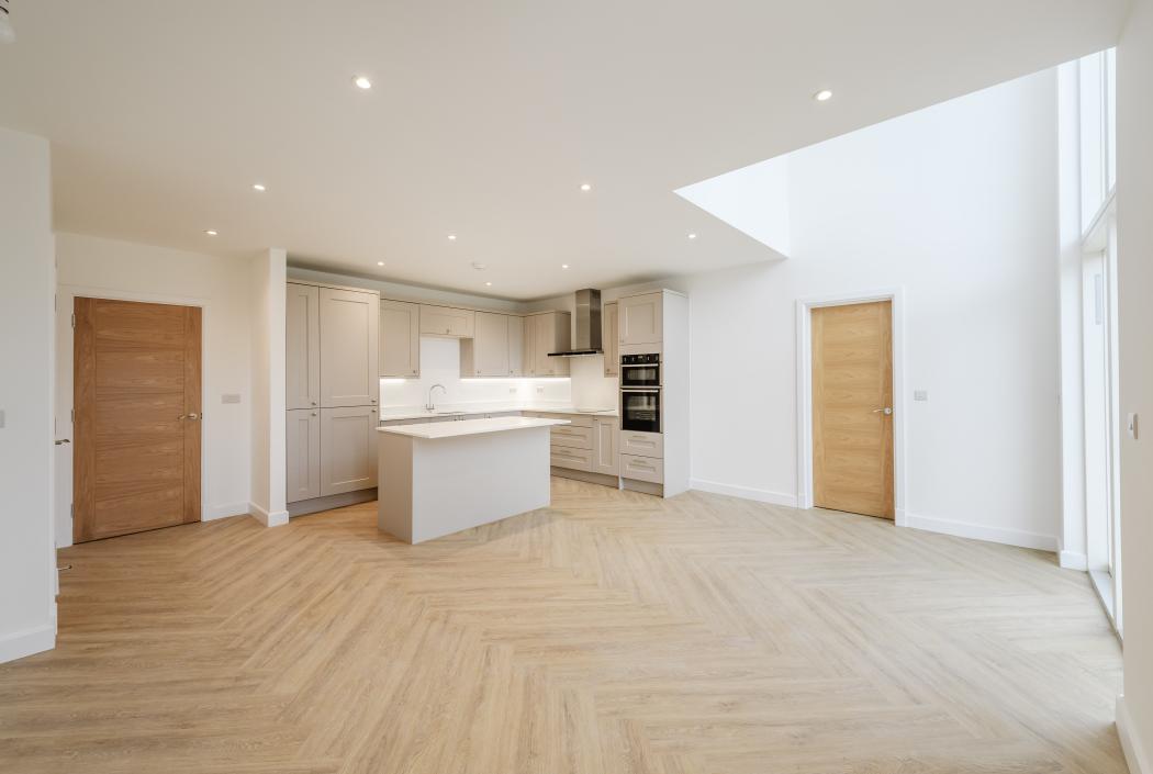 Inside, the home features a bright and welcoming dual-aspect living room, along with a stunning open-plan kitchen, living, and dining area. The dramatic double-height ceiling floods the space with natural light. The contemporary kitchen boasts stone worktops, a central island, and integrated Neff appliances, as well as a wine cooler, making it a dream for cooking and entertaining. A separate utility room and a downstairs WC add extra convenience.